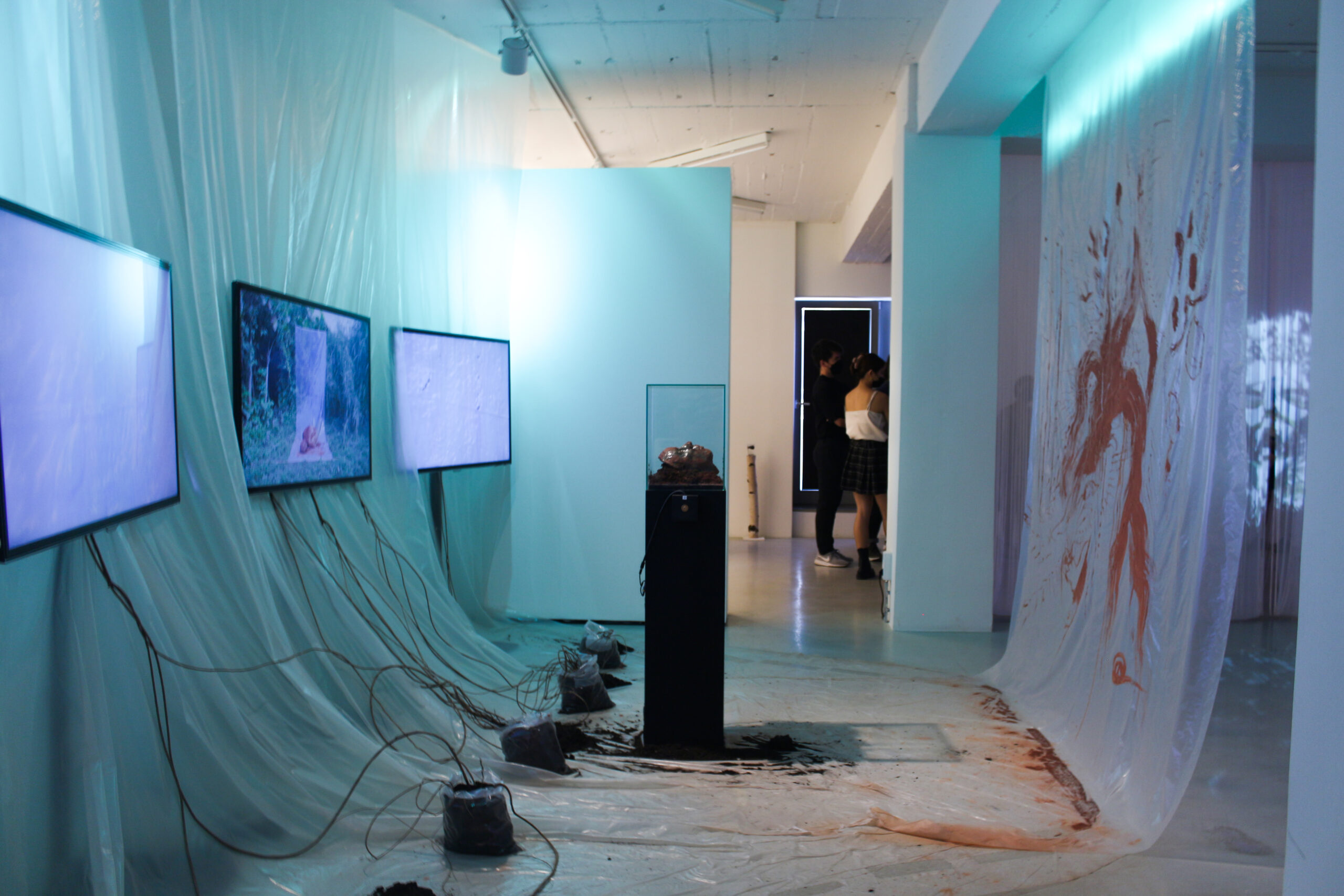 Encantadas describes the search for original Latin American identities of a young collective with three Brazilian trans* curators. A TRANSÄLIEN, Sanni Est and Ué Prazeres present seven artists* from the north and northeast of Brazil whose works and life narratives revolve around mystical cosmovisions. Their audiovisual artworks, sculptures and multimedia installations create a living space. The play of light and shadow and the use of plants and earth bring all the senses of the visitors to life and embody a collective strength.