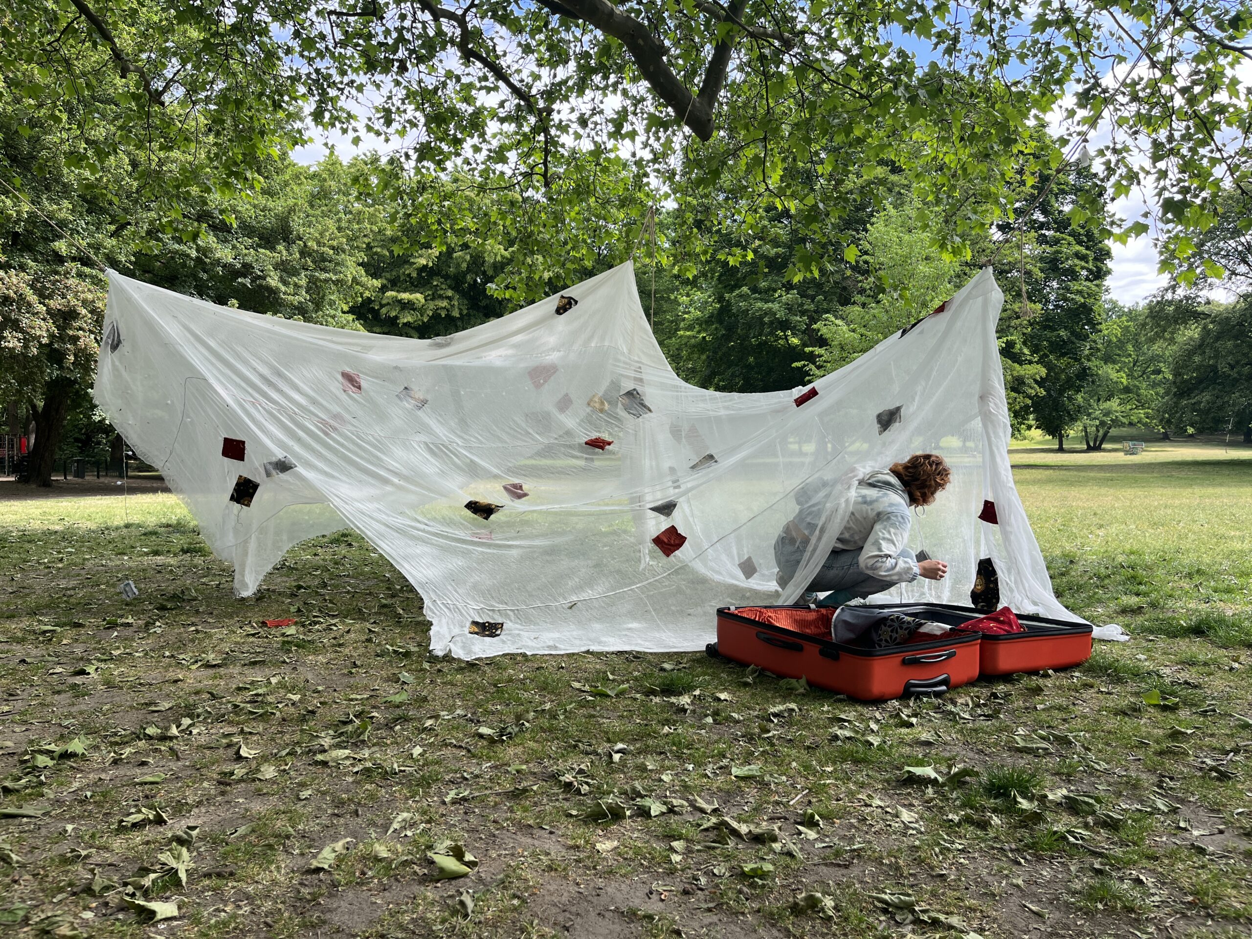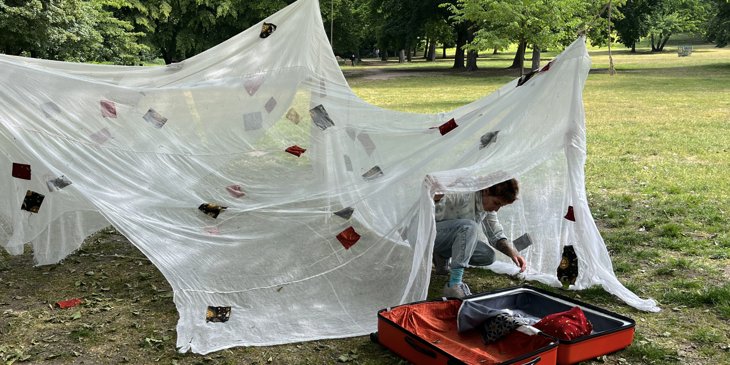 Based on the suitcase as the main object of the start of a journey, and the tent, as temporary shelter, HOME IS WHERE THE HEART BEATS creates a sensorial metaphor of the vulnerability and resilience that leaving and building a new home entails.